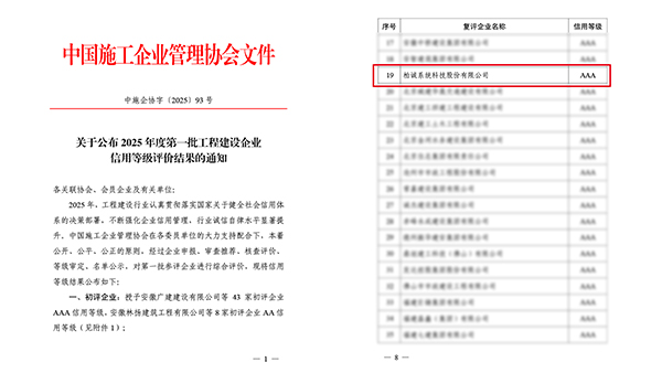近期,中國(guó)施工企業(yè)管理協(xié)會(huì)正式發(fā)布《關(guān)于公布2025年度第一批企業(yè)信用等級(jí)評(píng)價(jià)結(jié)果的通知》,柏誠(chéng)系統(tǒng)科技股份有限公司(以下簡(jiǎn)稱“BOTH”)作為復(fù)評(píng)企業(yè),順利通過評(píng)審,再次榮獲“AAA信用等級(jí)”證書。這一認(rèn)證體現(xiàn)了公司在合規(guī)經(jīng)營(yíng)、誠(chéng)信履約及綜合實(shí)力等方面的持續(xù)領(lǐng)先優(yōu)勢(shì)。