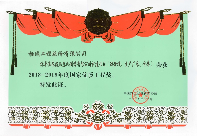 近日,我司參建的“惠氏制藥有限公司擴(kuò)建項(xiàng)目(蘇州輝瑞鉆石項(xiàng)目)”榮獲2018-2019年度“國家優(yōu)質(zhì)工程獎”。
