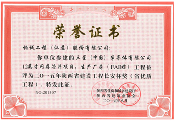 我公司參建的三星(中國)半導(dǎo)體有限公司12英寸閃存芯片項(xiàng)目:生產(chǎn)廠房(FAB棟)工程被評為二零一五年陜西省建設(shè)工程長安杯(省優(yōu)質(zhì)工程)