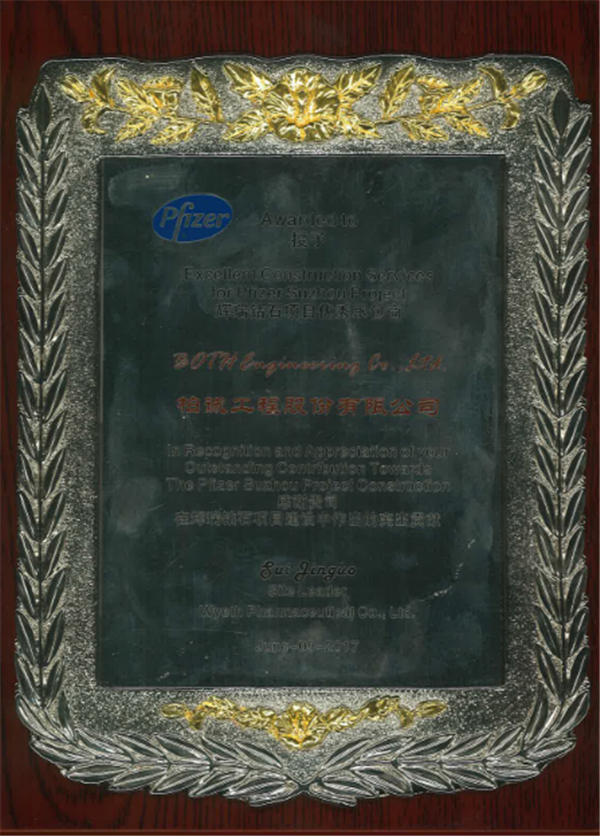 2017年4月,公司在蘇州輝瑞鉆石項(xiàng)目中喜獲150萬安全工時獎;2017年6月,柏城團(tuán)隊(duì)對項(xiàng)目作出了突出貢獻(xiàn),業(yè)主頒發(fā)“ 突出貢獻(xiàn)獎“獎牌。