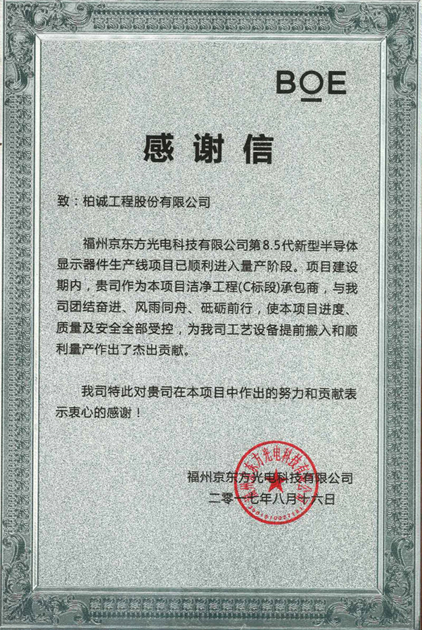 2017年08月,公司在福州京東方第8.5代線新型半導(dǎo)體顯示器件生產(chǎn)線項(xiàng)目中榮獲業(yè)主頒發(fā)感謝信。
