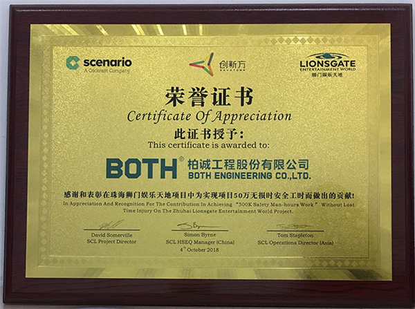 2018年11月,公司在獅門娛樂天地(珠海)項(xiàng)目中喜獲“五十萬無損時安全工時的榮譽(yù)證書”。