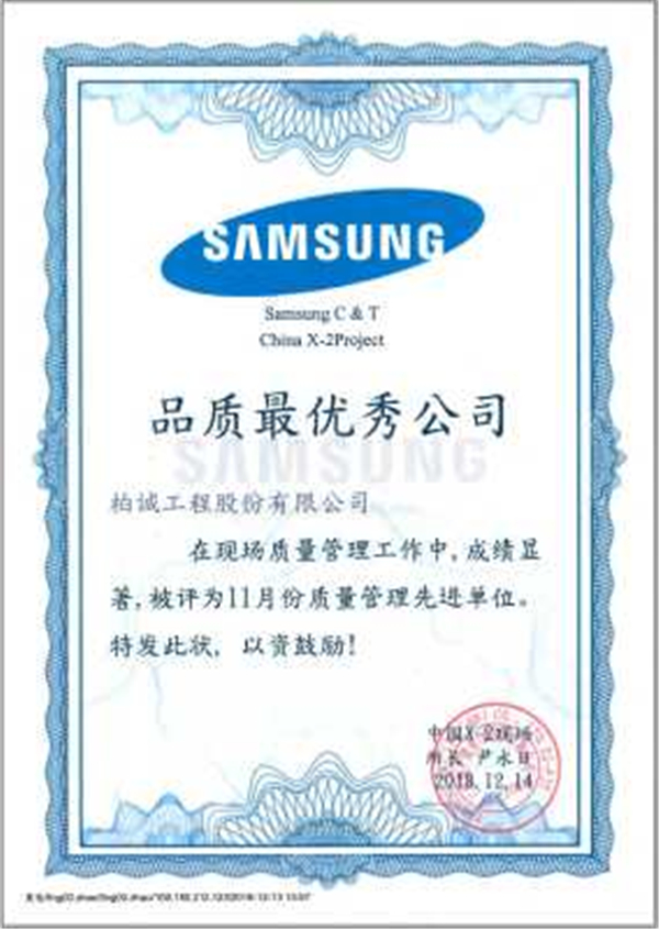 我公司西安三星項目部在西安三星X2項目的現(xiàn)場質(zhì)量管理工作中,成績顯著,受到業(yè)主和管理公司的表彰,被評為11月份質(zhì)量管理先進單位。